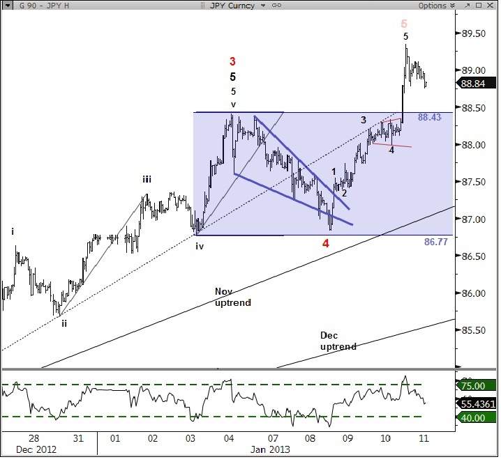 Sentiment extremes over the last month have failed to usher the pullback we proposed and again this week’s wedge in USDJPY led to another strong rally. Our two longer-term upside targets are the Fibonacci extension at 91.42 and the Head & Shoulders projection at 93.01. Near-term, the rally from 86.77 has unfolded in 5 waves again but the reversal so far is forming a bearish shooting star candle; a close near or below the open of 88.78 will cement a reversal. Any pullback is expected to find support at old resistance of 88.43 and then 88.34/00 where the previous small triangle correction formed. A break of overnight highs at 89.35 can signal a new wave higher. Levels: Support – 88.43, 88.34, 88.00 Resistance – 89.10, 89.35, 91.42.