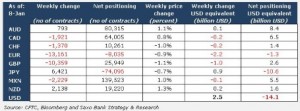 The sum of all the changes witnessed among the eight IMM currency futures tracked in this report led to a small reduction in aggregate short dollar positioning as GBP and especially EUR selling more than off-set JPY buying. The positioning among the commodity currencies was almost unchanged despite some decent moves on the currencies.