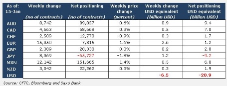 Hedge Funds and other large investors seem to have gone all in as the dollar was net-sold against all eight IMM currency futures during the week ending January 15 according to the weekly data provided by the US CFTC. Especially the EUR attracted renewed buying interest with the net-long position rising to the highest level since July 2011. The JPY was bought for a fifth week in a row as some investors seem to be viewing USD 90 as a potential near-term top in the market. The net-selling of dollars resulted in the aggregate short rising to USD 20.9 billion, the highest level since October 2 last year.