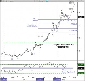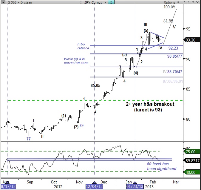 It can be helpful to look at key pivots in RSI; in the case of JPY, the 60 level has been significant have led to an important top in Aug and 2 key bottoms in Dec. & Jan. Momentum has again fallen to this level as prices trace a bullish triangle so it worth watching to see if the RSI 60 level can hold. Rather than correct in a sharp zig-zag it appears prices are marking time with sideways trade. (ch1) S/t, there is still no impulsive move that suggests a rally through triangle resistance at 94 but yesterday’s pullback did find support at a triangle target where wave-a was .618(wave-c). Support is now 92.77 with the more critical triangle uptrend at 92.29. A break through 94 can see a quick rally to the 2010 highs at 94.99, that level is also the triangle projection. Although expected we need wait for a break of 94 to signal a bullish resolution. (ch2) Levels: Support – 92.77, 92.29, 92.00 Resistance – 94.00, 94.22/46, 94.99.