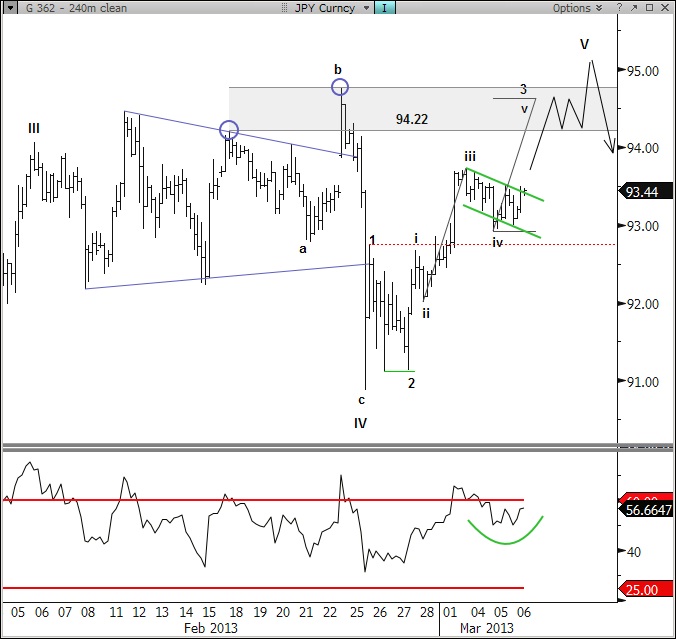 When looking at the daily chart or the 240min below, the action over the last 3 days has formed a bull flag to complete a small Wave-iv correction. In order to confirm the bullish implications a break above 93.73 is needed. This rally is all part of a final Wave-V higher that can take JPY to new highs and at a minimum to the May „10 level of 94.99. S/t, a break of 93.73 targets a zone between 94.22/63 the first is an extension target while the latter is the bull flag projection level. This zone is also the level of the last 2 pivot highs so minor resistance is expected in the 94.22/77 zone. Important support going forward is the pullback low (92.92): beyond that 92.75 is critical to the bullish call. For today we expect a break of 93.73 to be followed by further gains. Levels: Support – 93.00, 92.92, 92.75 Resistance – 93.73, 94.22, 94.69