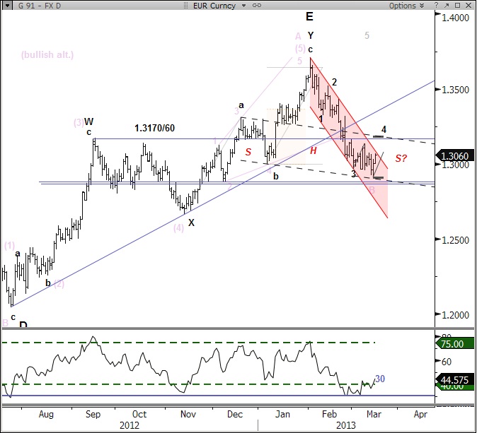 The bear flag outlined Wednesday did lead to a significant break of 1.2965 only to leave a bear trap. The subsequent rally back through key support and back into the bear flag raises the case that a right-shoulder of a head & shoulders top could be underway. The target for the top of the shoulder is 1.3160/80; a wave 4 target and symmetry level for the bearish top. (ch1) S/t, prices are attempting a bullish break of the February downtrend at 1.3070, next resistance above are the two highs near 1.3150. Beyond 1.3150, confirms that a more pronounced rally/correction higher is underway. We are expecting a 5-wave move to unfold to complete an A-B-C correction with a 1.618 extension target of 1.3183. This corrective pattern is know as an expanded flat, Wave A of the pattern was actually a smaller version of this expected correction. (ch3) Levels: Support – 1.3032, 1.3000, 1.2965 Resistance – 1.3070, 1.3150, 1.3183.