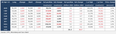 Hedge Funds only made some small adjustments to their IMM currency futures positions during the week ending April 30. Despite plenty of currency moves all going against the dollar the aggregate dollar position, derived from the eight currency futures tracked in this report, was only reduced by USD 0.7 billion to 16.2 billion. The main movers were the CHF which was sold straight back into a net-short position after just one week while the JPY was bought for a second week as sellers grew frustrated about the currency’s failure to weaken further, especially through the important 100 level on USDJPY.