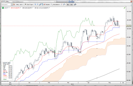 A very strong Chicago PMI and upward revision to May University of Michigan Confidence have USDJPY avoiding a collapse through support once again – but next week is the real test for USDJPY and most major currencies. USDJPY trying to rally again late today after coming close to challenging the 100.00 level again and having a peek below 100.50 local support as the strong US data knocked the stuffing out of treasuries again, which appeared to be staging an end-of-month rally. It’s readily apparent that the USDJPY zone between 100.00 and 100.50 is the critical zone of support technically.