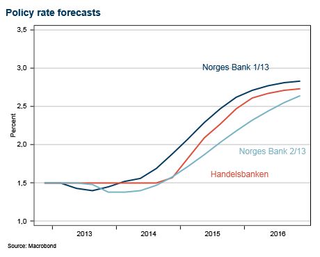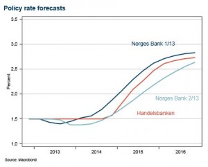 The lowering of the interest rate path was due mostly to to lower capacity utilisation in the Norwegian economy and lower cost and price pressures ahead. The fact that Norwegian banks are increasing interest rates also pulls the interest rate path down. Economic growth prospects among Norway’s trading partners also contributed. Somewhat higher than expected inflation in recent months, the weaker than expected krone and somewhat lower money marked spreads contributed to pulling the interest rate path up.