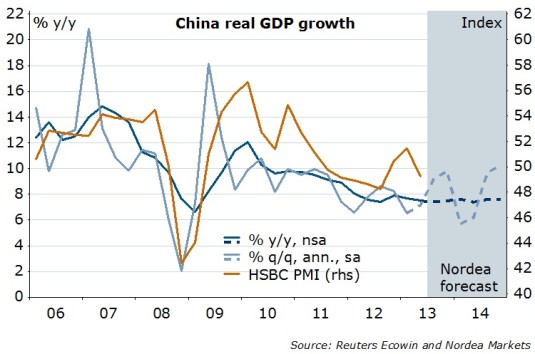 The Chinese economy lost speed further in Q2 and grew by a mere 7.5% y/y, in line with market consensus and slightly above our forecast of 7.4%. The accumulated growth rate for the first half of 2013 turned out to be 7.6% y/y.