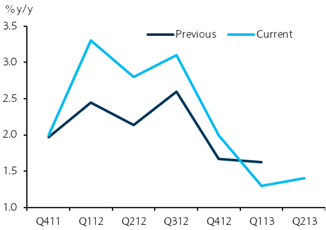 Real GDP rose 1.7% q/q (saar) in Q2, above our forecast (0.5%) and the consensus (1.0%). However, downward revisions to growth in the previous four quarters mean that the underlying trend is no stronger (Figure 1). Indeed, y/y growth, at 1.4% in Q2, was the same as our forecast and the previous data vintage had implied and now suggests a greater loss of momentum in H1 (Figure 2).