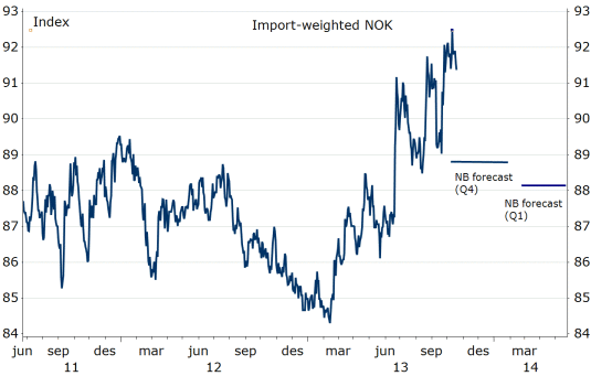 • NOK has weakened since the September report and is approximately 3% weaker than Norges Bank’s forecast for Q4. Judging by the two latest monetary policy reports that should lift the interest rate forecast by 30bp after some quarters. Apart from this financial conditions have been about as expected.