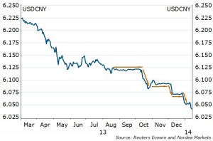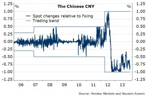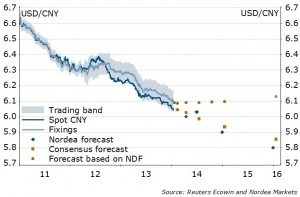 Because of the time factor, we revise our 3M forecast from 6.1 to 6.0. For end of June 2014, we actually see the chance of a limited depreciation against the USD. The argument is that the trading band in which the spot CNY is allowed to deviate from the central bank daily fixing rate, currently standing at +/- 1%, is likely to be widened in March-April (after the Chinese New Year holiday). To demonstrate that the CNY is no longer a one-way bet, Beijing may have an incentive to weaken the yuan immediately after the band widening. At least it happened in April 2012. On a longer horizon, we still expect the CNY to gain vs. the USD.