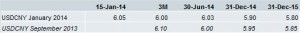 Because of the time factor, we revise our 3M forecast from 6.1 to 6.0. For end of June 2014, we actually see the chance of a limited depreciation against the USD. The argument is that the trading band in which the spot CNY is allowed to deviate from the central bank daily fixing rate, currently standing at +/- 1%, is likely to be widened in March-April (after the Chinese New Year holiday). To demonstrate that the CNY is no longer a one-way bet, Beijing may have an incentive to weaken the yuan immediately after the band widening. At least it happened in April 2012. On a longer horizon, we still expect the CNY to gain vs. the USD.