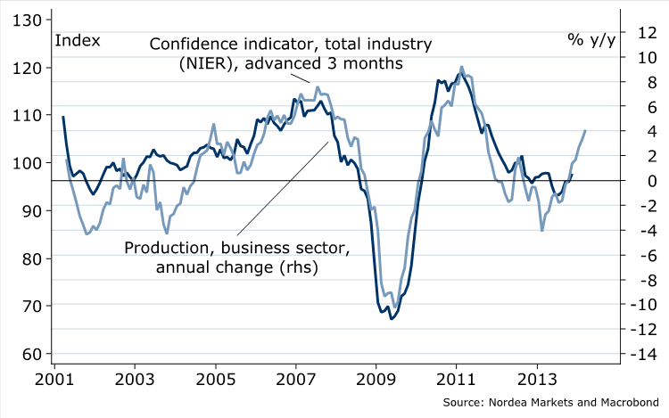 With the manufacturing industry now recovering, growth is broad based and GDP growth finally seems to be picking up. We have the same forecast as the Riksbank for Q4 GDP, +0.7% q/q, which is within reach.