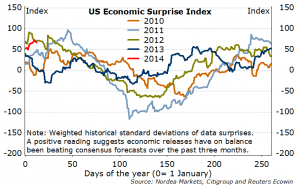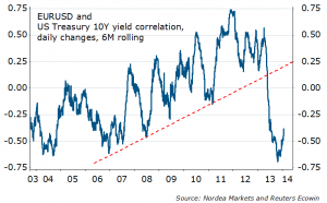 Weird, isn’t it? But I take it at face value. A streak of positive US macro data behind us, raises the threshold for further positive surprises – tailwind for bonds, headwind for stocks going forward. And…USD? Admittedly, last year’s UST yield-USD strong negative correlation has faded a little, with USD stronger on lower UST yields in recent few weeks…flow to the US long-term Treasuries (me in)?
