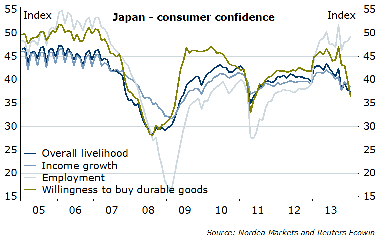 Japan…struggling to figure out whether quantitative easing is good or bad, as BoJ’s Kiuchi warned of negative side effects last week. Agreed. So far – the JPY-fuelled inflation and worsening trade balance (J curve?!) – another record deficit hit will likely be reported this week. Even machinery orders, which were generally strong last year, recorded biggest plunge since 1992 in December (ehm… weather?). But, most importantly, consumer confidence: people expect jobs, but not income? Shame on you, <insert Japanese company name>. BoJ? Meeting this Tuesday and, as the saying goes, “if you don’t know what to do – do nothing”. Keeping the USDJPY short, targeting sub-100.