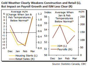 “There is a clear relationship between cold winters and sluggish trends in housing starts and retail sales. There is also a suggestion (albeit less clear than for starts and retail sales) that payrolls can be adversely impacted by cold February temperatures, such as those seen this year. But for the ISM there is little correlation, making us more confident of a rebound following January’s surprisingly low reading,” CIBC argues.