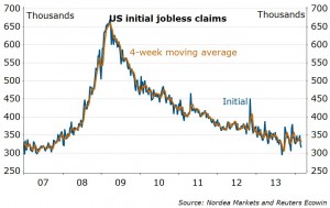Initial jobless claims data was encouraging, though one should never put too much weight on one week of data. Claims fell from 324k to 315k, the lowest number in six months. This was enough to push the more reliable 4-week moving average to the lowest level seen this year and suggests the labour market momentum is increasing again.