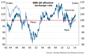 Talking the talk… Yes, Draghi said that exchange rate is “significant” in their assessments for inflation last week, but so he did after the ECB meeting. From ECB’s Monthly Report, one can also read the currency effect on growth: a 3% permanent appreciation of effective EUR (with historic beta at 1.6, EURUSD around 1.45), would bring both growth and inflation lower by 0.1/0.2ppts in the forecast horizon. Not too much to worry about, is it?…In line with Draghi’s famous last words: “Any material risk of inflation expectations becoming unanchored will be countered with additional monetary policy measures.” Stay calm and keep holding EURUSD for a move toward 1.42.