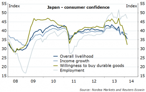 Japanese consumers not happy… because, logically, higher inflation means you buy less stuff! Not good news for the Japanese stocks, neither the USDJPY… More easing? So far the BoJ seems unbudged, judging from Kuroda’s et al. comments. Thus: it must get worse before it gets better. Holding the USDJPY short, we are going toward double digits, clearing the next support at 101.20 on the way.