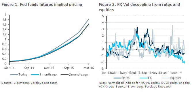 FX volatility has decoupled from volatility in rates and equities markets. One explanation could be that movements in rates have been fairly correlated, so despite reasonably large moves in rates markets, rate differentials have not moved dramatically; hence, currencies have largely stayed in their ranges. Indeed, across most major currencies, according to our short-term drivers model (a factor model that analyses moves in FX relative to equities, rates and commodities), the betas of FX returns to rate differentials across most parts of the curve are at the lower end of their ranges.”