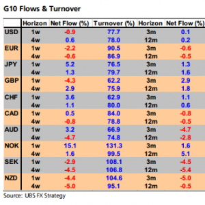 Net euro selling over UBS’ books hit a 5-week high last week as ECB President Draghi indicated the strong euro’s disinflationary impact “will have to be addressed”. The following are UBS’ analysis for last week proprietary flows for EUR/USD, USD/JPY, GBP/USD, and a selection of other FX pairs as reflected by hedge funds, assets mangers, and corporate clients in UBS’ books.
