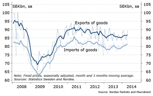 The trade balance came out at SEK 4.6bn in April, 4.2bn lower than in April last year. The drop reflects the negative calendar effect as well as rising imports.