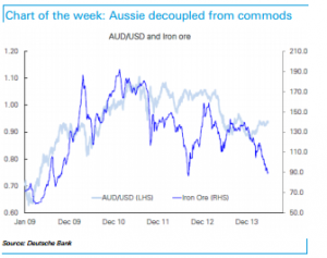 The FOMC median projection of the long term cash rate was revised down from 4% to 3.75%, which should be a positive for the Australian dollar. According to Adam Boyton, AUD/USD’s correlation to the 10 year US treasury yield has gone up markedly since mid-2012 after the market started anticipating the RBA would keep rates stable around 2.5% for the indefinite future. The dislocation between AUD and iron ore prices can thus be at least partly explained by the rally in US treasuries.