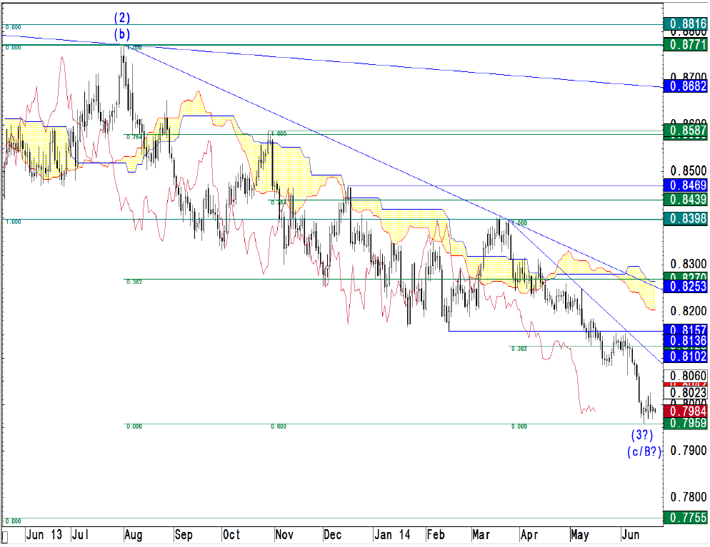• For the latter to receive fresh support it would take two consecutive higher hourly closes of the lagging line above the cloud (currently at 0.7998), but in order to really dent the long-term downtrend it would take breaks above 0.8102/26/57 (daily trend/minor 38.2 %/pivot).