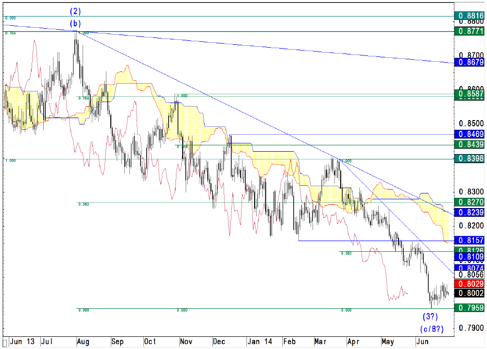 Attempts to gain some up-momentum however failed so far so that it would take a break above daily trend line resistance at 0.8074 to at least be able to challenge key-resistance at 0.8126/57 (minor 38.2 %/pivot). Particularly below 0.8074 though, the market remains vulnerable to a break below 0.7959 for a straight extension lower.