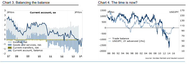 Equally important is the so-called “J curve” effect – the delayed impact of currency weakening. If history is any guide, the effect of JPY weakening takes up to two years to show through in net exports. Consequently, the effect of last year’s JPY weakening on trade only starts working now (Chart 4). Japan’s current account balance has already turned positive again this year (Chart 3). The key driver is still net income from abroad, which last year rose to the highest level since 2010. But even the trade balance stopped widening, and now the key is to sustain this development. The improving current account should, other things constant, prevent further JPY weakening. External factors matter too.