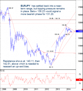 EUR/JPY has settled back into a near-term range, but topping pressure remains in place. Below 136.23 would signal a more bearish phase for 131.20. Resistance shows at 140.11, then 142.51, above which is needed to reassert an upward bias.