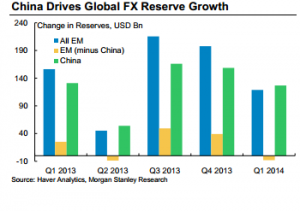 In fact, EM ex-China net sold FX reserves in 1Q14, while China accumulated over US$125 billion (see Exhibit 1). China’s FX purchases have meaningful impacts on global markets. They may well have contributed to the rally in US fixed income entering the year. And China’s diversification outside of USD can provide a cushion for other FX, most notably EUR, which serves as the world’s second major reserve currency.