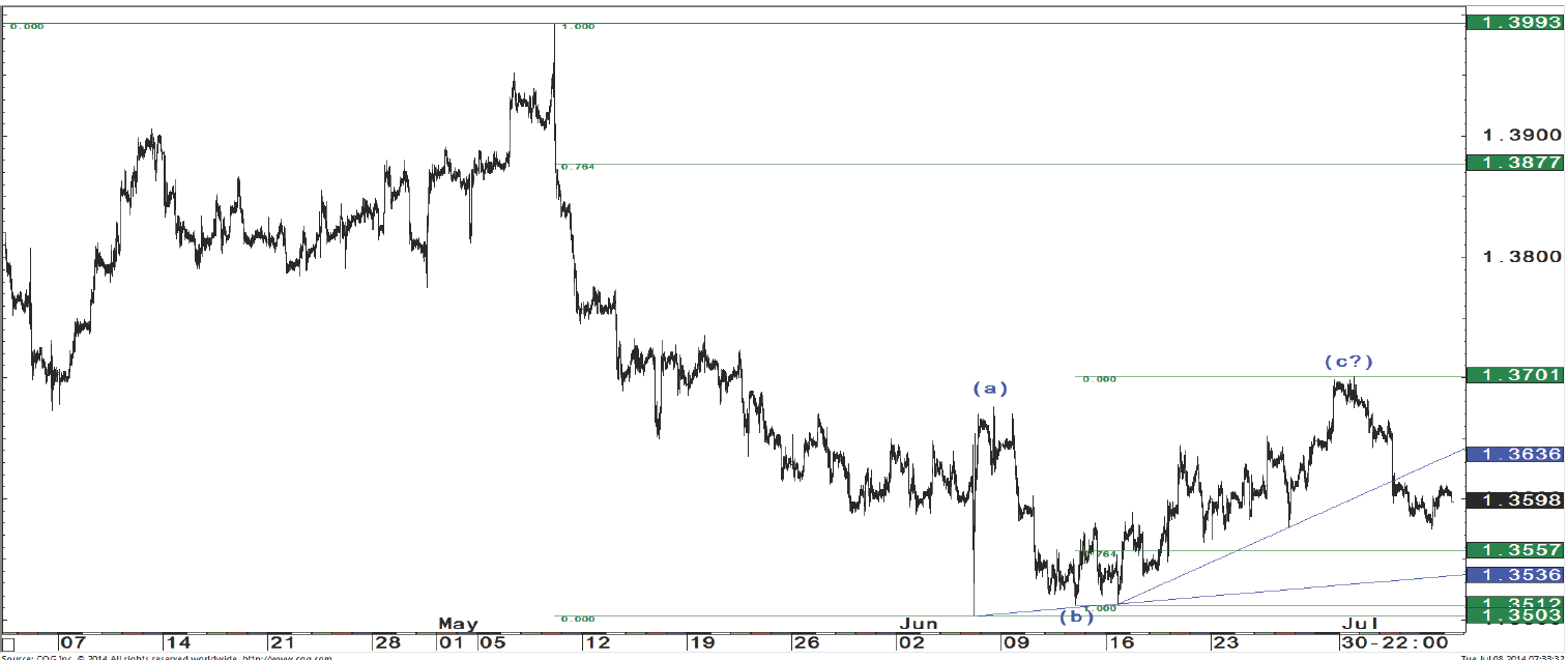 The failure to even come close to 1.3877 (minor 38.2 %) and the following break below hourly trend line support (now resistance at 1.3636) leave the market at risk of testing 1.3477 (2014 low) straight away.