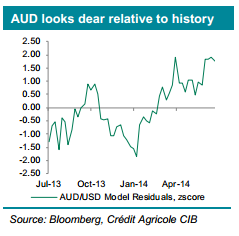 AUD remains one of the most overvalued currencies in the G10. In simple terms, while the gap has narrowed between the real effective rate (REER) and the10yma from as much as 26.5% in 2011, AUD still remains about 5% overvalued based on this metric. More complicated econometric models (such as FEER and BEER) suggest fair value is south of 0.90 given Australia’s current account deficit, worsening terms of trade and limited productivity gains in recent years.
