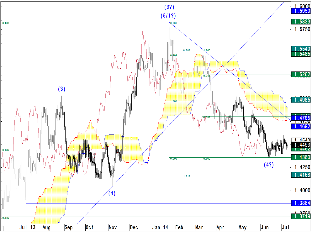 Having only marginally overshot the projected 4th wave target at 1.4430 (int. 38.2 %) we still see good chances that a 5th wave advance is looming which would take us all the way up to the previous high at 1.5833 and beyond.