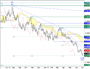 An intermediate bounce could however occur anytime but would have to display two consecutive higher hourly closes of the lagging line above the cloud (currently at 0.7946) and a break above hourly trend line resistance at 0.7983 to support a stronger bounce into 0.8047/98 and possibly to 0.8242 (daily trend/int. 38.2 % on 2 scales).