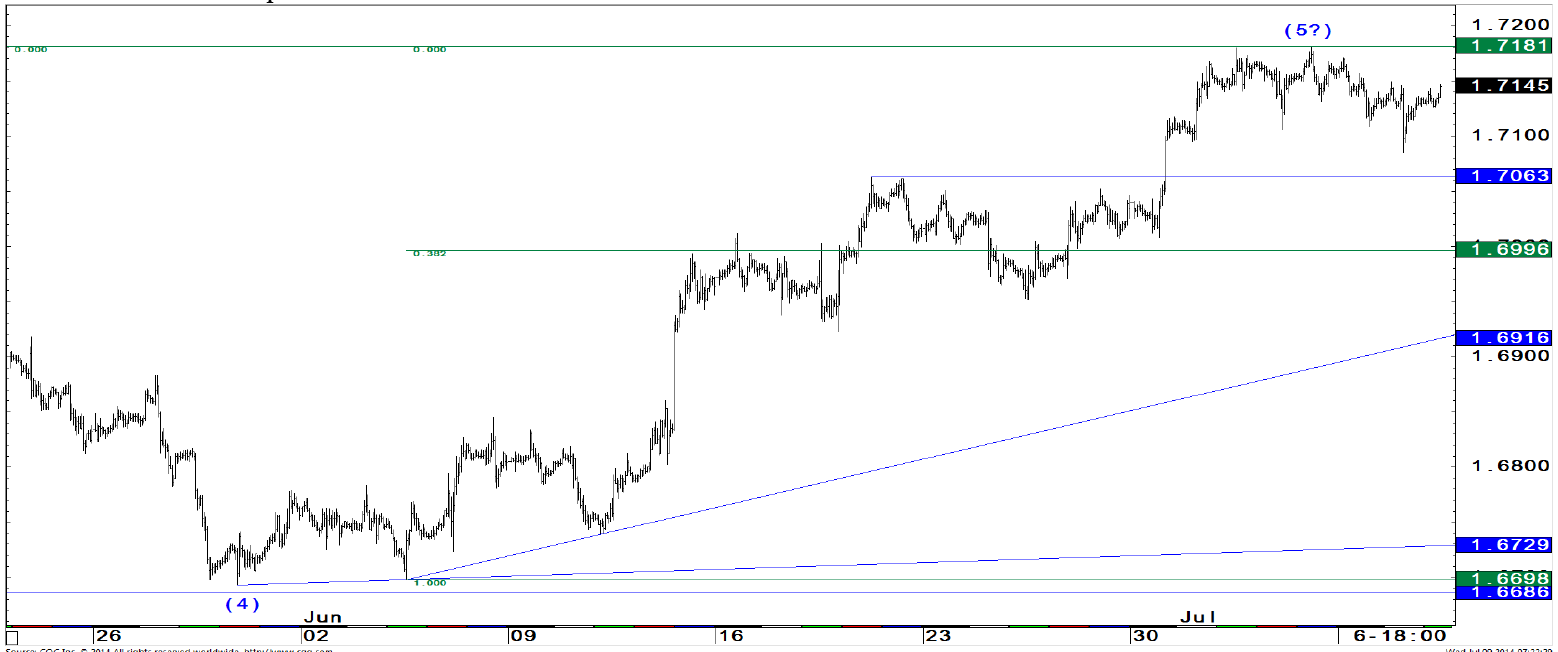 Looking at the big picture there is now nothing left in terms of resistance up to 1.7332, followed by 1.7768 (50 %/C = A). Only a break below 1.7063 (pivot) and a decisive hourly close below 1.6996 (minor 38.2 %, i.e. below 1.6970) would now question this bull-view.