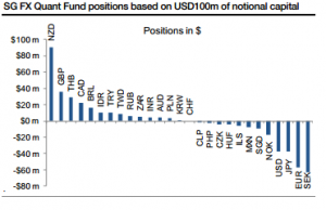 The most substantial change in the positions of the SG FX Enhanced Risk Premia strategy over the week has been the cut by around a third of the long NZD position. In addition, we have slightly increased the long GBP and short EUR positions as well halved the long CAD.