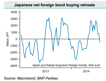 Portfolio flow data reveals that Japanese investors were net buyers of foreign bonds for the week ending July 18 for the 2nd straight week but buying declined to JPY116 billion from the previous week’s strong outflow of JPY681 billion, notes BNP Paribas.