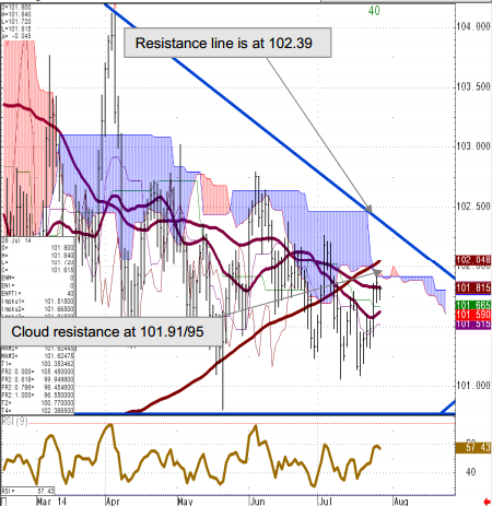 “This is located at 101.91/95 today and is reinforced by the 2014 downtrend at 102.39. We view this market as sidelined and until we take out the downtrend on a closing basis this will remain the case.,” CB projects.