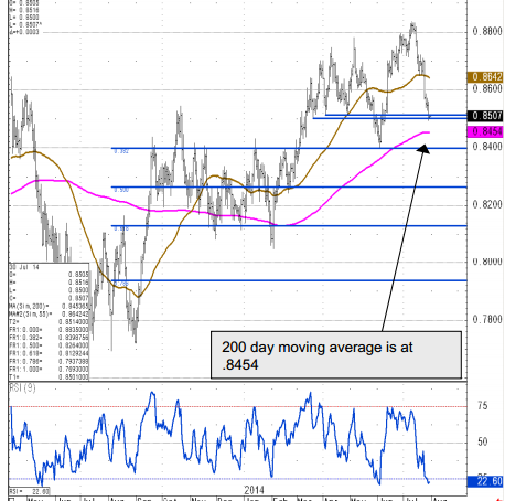 Very near term the down move looks over-extended and we would allow for a small rebound ahead of further losses. We would allow for a retracement in to the .8595-0.8640 zone ahead of another swing lower. We would use this rally to enter new short positions) The market will stay directly offered below the 55 day ma at 0.8642.