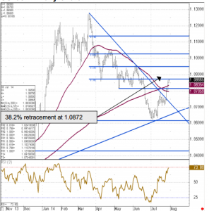 USD/CAD continued to see a rapid rally higher, which has now eroded the 4 month downtrend, the 200 day moving averages and the lows from May to reach the 38.2% retracement at 1.0872.