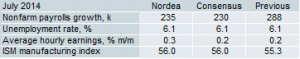 We expect a 235k gain in nonfarm payrolls in July following the surprisingly strong 288k rise in June. So another solid report, actually the sixth in a row with more than 200k new jobs if we are right. The consensus is 230k with a 24k standard deviation.