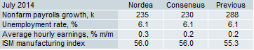We expect a 235k gain in nonfarm payrolls in July following the surprisingly strong 288k rise in June. So another solid report, actually the sixth in a row with more than 200k new jobs if we are right. The consensus is 230k with a 24k standard deviation.