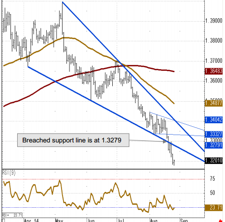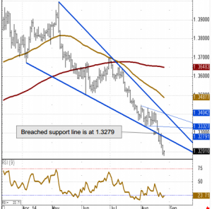 “Today the currency pair is likely to stabilise, however. Resistance comes in along the breached support line at 1.3279 and around 1.3333/36 with further resistance being seen along the three month downtrend line at 1.3404,” CB projects.