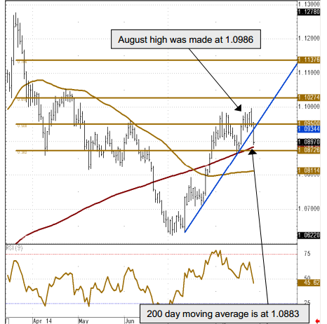 USD/CAD’s July failure at the psychological 1.1000 level has forced it back below the 200 day moving average, 38.2% Fibonacci retracement of the March-to-July descent. This is why we have neutralised our short term forecast. Should a daily close below the current August low at 1.0861 be seen, the 1.0824/11 support zone, made up of the May lows and the 55 day moving average, will be in focus.