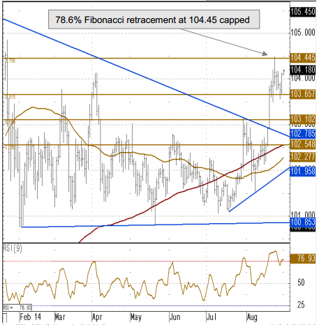 “Minor support below 103.66 comes in around the July peak at 103.15. The August high at 104.49 is regarded as the last defence for the 105.45 2014 peak,” CB adds.