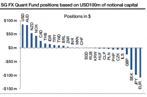The main change in terms of positioning this week has been the increase in the short JPY and long CAD position. The SG FX Enhanced Risk Premia strategy continues to have sizable longs in USD, AUD, NZD and NOK.