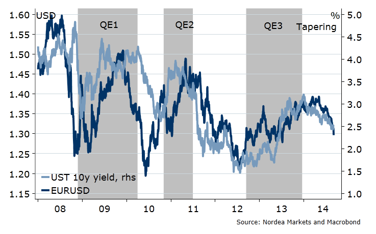 Looking through the of inconsistencies of ECB action last week (at least 3), the base rate is as low as it can get, and the September 18th first TLTRO, followed by October 2nd ECB meeting, beginning of European ‘QE’, will allow to test my ‘buy on rumour sell on fact” thesis, which worked well for Fed’s QE. (More central bank money -> more risk taking -> cheaper risk-free bonds -> weaker USD)