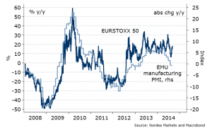 Survey data Draghi’s guidepost, it is clear from last week’s ECB meeting. What he used to justify EUR strengh earlier this he now uses to push its weakness (currency guiding). Thus key question is whether the recent decline in European manufacturing PMIs is a temporary blip, notably deviation from the US’ cannot persist. But PMIs will largely depend on stock market performance, in particular, the hope that ECB action and AQR will help banks (and their equity prices), and so will the EUR. Circular reference #error.