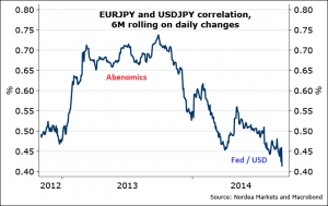 While the 2013 was the yen story – seen from positive high EURJPY and USDJPY correlation – this year, since June, it has been mainly a “strong USD” story, as the EURJPY and USDJPY have decoupled.