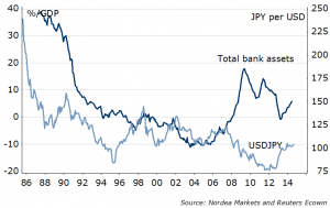 Another salient trend, highlighted back in 2012, is the resumption of the dissaving in Japan. Indeed, the Japanese household savings rate, after a temporary shock, has resumed the fall, is currently negative just as the trade balance. Given the demographic trends, the trade balance will probably be only temporarily supported by the past JPY weakness. This means Japan’s relative international investment position (accumulated current account balance, adjusted for valuation changes), may turn against JPY in coming years, just as both the US and Europe have become more frugal and competitive after crisis. Meanwhile, the Japanese corporates, after many years, have finished deleveraging (trend supporting JPY), and the total bank debt/GDP has turned up, and has gone up since 2006. The net FDI outflow has only accelerated since, also to the JPY disadvantage.